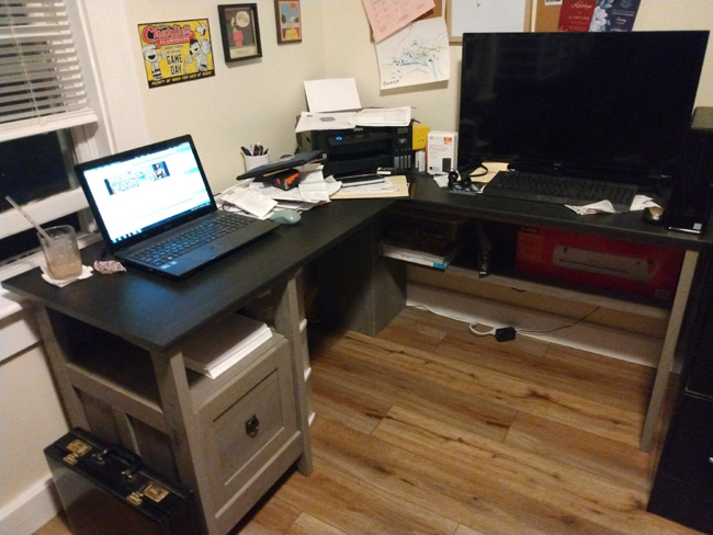again. I need to fix it or I am pwned. Earlier this month blueberry raking didn't turn out so well when it was kind-of a crappy crop, it was 100 fuckin' degrees for half the limited season, and then I got an infection and needed to recover from that. I thought this year would be my best-ever blueberry raking year from a time-management perspective, but nope it was terrible and I got home all backed up on everthing. So what's the problem here? (I don't regret going raking I'd do it again every time.) I have three problems that need solving. First is this MASSIVE garage job I'm doing in Brewer. I really enjoy the work, but holy crispy crap it is a mammoth job. I'm not there 60 hours a week, far from it. I probably average 15-20 hours a week there and I could do the math since it's all on my spreadsheet, but F that I'm not doing that math. So far since I started that job last fall it's up to $41,862 and it's only roughly halfway done from the perspective of time. I estimated it might cost $100,000 total but some of those costs aren't on me. I'm not installing a heat pump because I don't know how. I'm not pouring a concrete floor for parking because I don't know how. I wish I did know how to do the concrete because I need a couple slabs here at our place, but that is for another day... This is our desk right now: