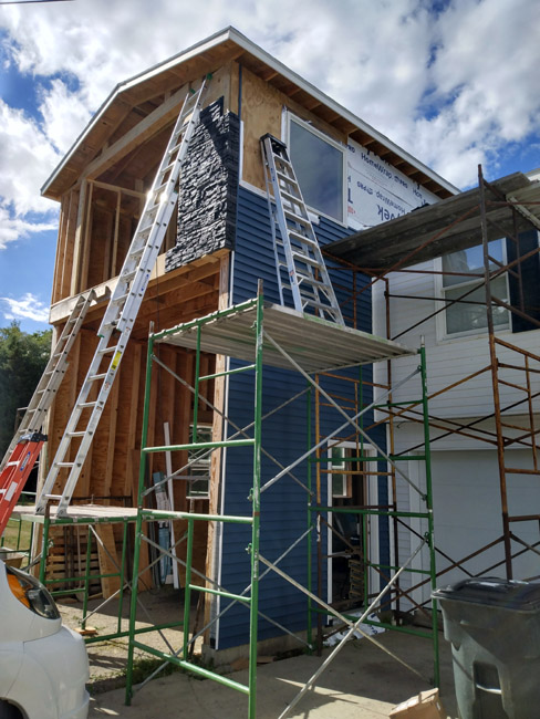 ^Genstone is a faux stone made out of a styrofoam-type material that is pretty easy to cut and install. Home Depot sells it to order for delivery. Other places sell it as well, but Home Depot is easy since I have my pro account and I had a 10% off coupon. Plus it's a local place for returns, if needed. The Genstone looks awesome, but it's close to $20 per square foot. OMG ARE YOU FUCKING KIDDING ME?! WHAT A BUNCH OF CRAP! It's just dense styrofoam. Not like the styrofoam peanuts in packing material, much more solid and durable than that, but still... foam stuff. Someone lives in a mansion as a result of this invention hehehe. The front will cost $2000 or so just for the Genstone to cover what, 100 square feet? He might want the Genstone on the porch interior walls as well so that would add at least $1000 more. I'll try to talk him out of that one... I started installing it 16 feet in the air yesterday as it started to rain. We got a heavy drizzle for a bit and I got a few pieces on before it was too wet on the ladder so I did framing on the second floor under cover. I worked there close to 6 hours yesterday and just under 4 hours today. (I worked full days both days as the other hours were focused on tax work for clients.) I can't use my ladder to do the Genstone because it's not like vinyl siding at all. I'll put the ladder on new siding, but if I put the ladder on the Genstone it will scuff all up and that would be an epic fail. The ladder needs to be below or above it, and right now below is not an option and neither is above. So I rented more scaffholding this morning for another $250. I got $500 of scaffholding on the invoice for the owner, but I got it for a month and it saves a lot of time. A LOT. Plus it's much safer than the ladder. It's well-worth the cost for the hours it will save on the job. I definitely was ridiculous today with my setup. It was really stupid-looking, but it got me where I needed to be. Mostly. How many ladders did I need?