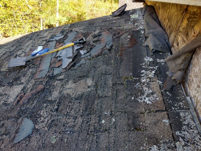 I really need to get this garage done because it seems we might get the restaurant back. That is far from a guarantee, but after today I'm 80-90% confident it's going to happen. Mack's, the place that was there since April, will be leaving so it's just a matter of negotiating a fair deal for all parties. I met the landlord today and he sort-of dropped a bombshell on my ass. He basically wants me to look after his plaza for him so he gave me some keys. If I can get a vacant unit rented there is a commission, and I want it. I'm not his property manager, but I have a feeling it could lead to that. He lives up in Caribou so he's not around much and I know he wants someone local to help. He had someone, but she left. I feel like I really don't have a choice. If I tell him no then he won't give us the space back for Mad Kat (he didn't say that, but it's what I expect) but if I work with him we probably get the space back. Why do I want it back? We have the right people in place this time and it will be different. Plus I can put my tax business back there and it's likely to be a win for everyone. More to come as the months rolls on... On Friday after I dealt with those friggin' heat pumps I had time to start stripping down this porch roof on the back of our house: