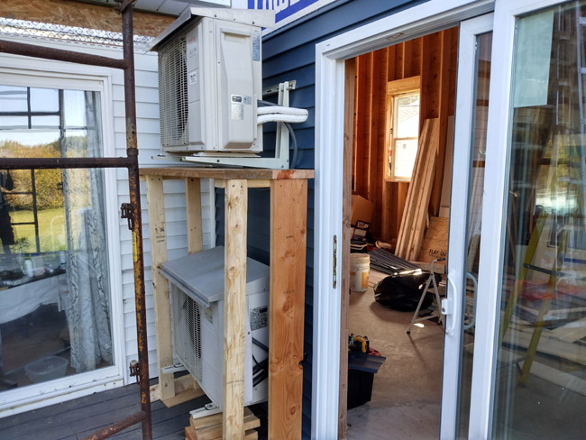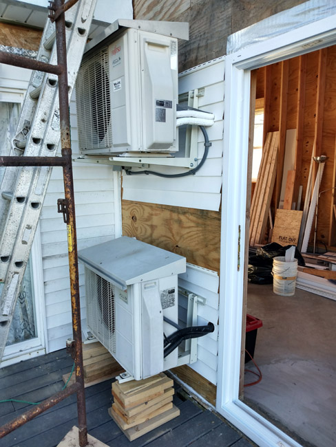 Two friggin heat pumps there that needed to get out of the way so I could install the blue siding. The homeowner paid some other handyman to put white siding on there, but it was not going to work since it should have been Bayou Blue. Plus there was no way to tie it into the slider or the inside corner so it all had to be removed. I also had to crawl under part of that bottom heat pump to use my multitool to cut out some worthless OSB. I spent HOURS there just to get maybe 35 square feet of siding installed. What a bunch of crap! I could have had that siding on in an hour if not for those gods damned heat pumps. I had to dismount them and support them and I almost told the homeowner he needed an HVAC person to come remove them, but I know that would be very expensive so I took on the challenge and made it work. I hated wasting 4 man-hours billed to the owner for dealing with it (took tons of extra time) but it was the best option financially so I'm glad I did it.