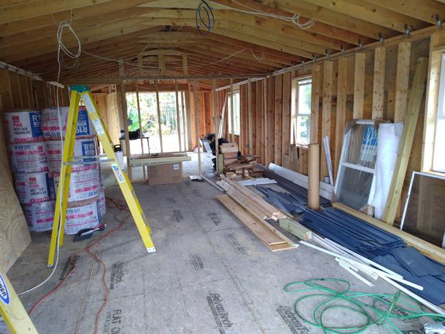 We used the hoist and that 2x8x16 as a guide and that shit worked awesome. I'm no engineer, but I acidentally pulled that off like a champ and I couldn't have done it without a competent helper so thankfully my wife is not a nincompoop. She's very smart, but she's a lot to deal with emotionally at times. Notice how I put those bags of insulation underneath? Hehehe. I thought it something failed at least I'd have a chance to not destroy a $600 slider. Kat also stayed to help me install the slider on the river-facing west side so now I can stop the wind-tunnel effect when the weather sucks. I can close that slider door and even run a little heater, and that will be critical when we start sheetrock. I wanted to start sheetrock this week, but there is still a lot of prep and insulating to do so that will have to wait. My helper was sick the last two days, but I don't feel like I'm behind schedule because I've gotten a bunch done this week and getting those sliders elevated and one installed is a huge win. I also worked more on the rear deck area once the temp crept above 50:
