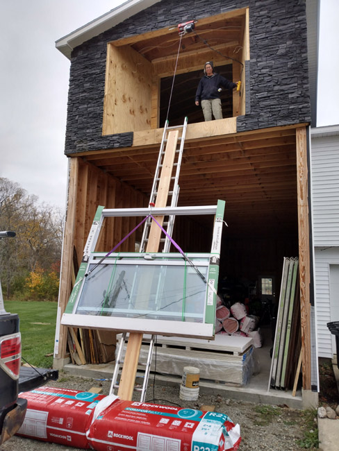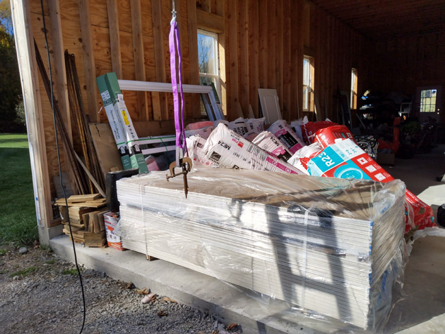 ^Two big openings, one on each end for a slider on each end = wind tunnel. What a bunch of crap! (Other opening not shown in the photo as it's behind where I was standing.) I was hitting a little bit of a wall in terms of figuring out the best way to get 50 pieces of sheetrock up to that 16-foot high second floor. Hammond Lumber could have delivered with a boom truck, but I didn't want all that weight in one spot up there and I'm not 100% sure it would have fit. There is room for it on the deck area, but barely enough. The homeowner also has a 350-lb pool table (still in the box) that needs to get top-side as well as the two sliders and a bunch of other stuff. Homeowner said he's fine with my renting a crane or lift, but I didn't see the value in having a crane when each piece of sheetrock has to go individually. $200 a day for the technology to get stuff top-side?! No thanks! I bought this instead: