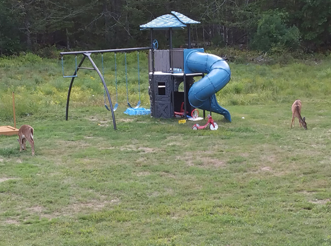 Yesterday morning around 0700 was a bit crisp, mid-40s and soaking wet from a rainy Sunday. The deer were out back and when the sun crested the house the two skippers laid down right next to each other and ate the foliage. They were there over a half-hour and they didn't even run off when my awesome wife went down to feed the birds. OMG. There are 4 total deer including what I assume are the two mothers. Tonight around 1800, broad daylight, everyone home: