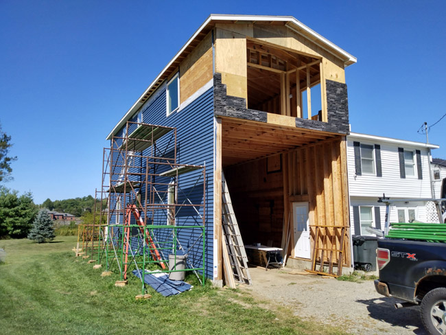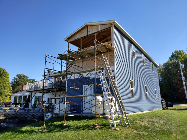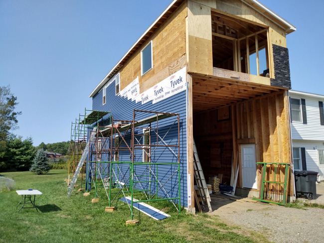 ^I worked on the front top for a few hours yesterday, and today Daniel and I crushed it mostly working on the south side where all the scaffolding is in place. We got a lot of siding installed and we did it safely. No injuries = win.