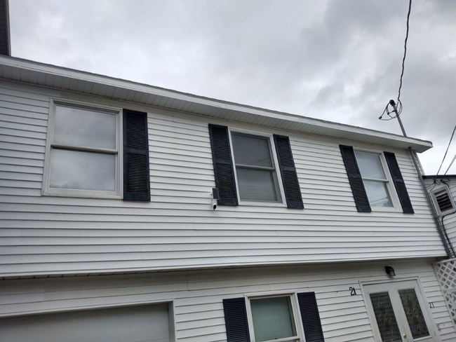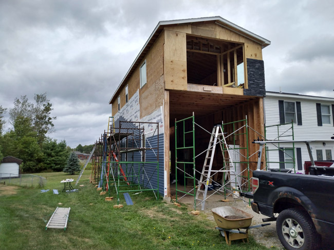 and the Red Sox. The NFL season also began last night with the Cowboys vs. the Eagles. I watched a little of the game before I bivouaced, and tonight the Chiefs play the Chargers in Brazil, but that one is on YouTube. All I wanna know is why? Why do NFL games have to be exclusively on Youtube? I don't even know how to access that one. Yes I use Youtube on this old-ass Acer computer, but I don't think I can actually watch a football game on it. I probably need to subscribe and F that. I use YouTube for 80s music and the occasional instructional video. Last week I watched a couple videos on how to install Genstone... I ordered more Genstone for that massive garage job in Brewer (faux stone on the front) and it arrived this afternoon. I'll install some next week, but today we were focused on siding the south side. I have a lot of scaffolding there and that makes a HUGE difference in not only safety but also production. It does take time to set up and break down, but once it's in place I can fly through a section of siding, soffit, trim, etc. Here is how it looked mid-afternoon today: