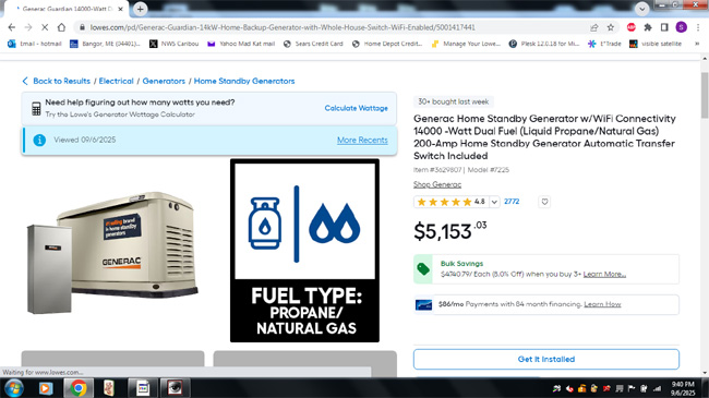 I actually ordered two of them! One for our house and one for Debbie and Dillon's house. We considered getting just one big generator to power both houses, but that's not really possible due to the electrical side of things. It's a Generac 14,000 KWH that we will have to run with propane since natural gas isn't available out here in Eddington. I got my military pricing so each of us "only" paid $4900 with sales tax for the unit itself. It's supposed to arrive for pickup at Lowe's around the 24th, but we shall see. I need to get Fire and Ice and Sparkies out here to hook it all up once it does arrive and I'm sure we will need some add-ons and maybe a slab to set it on. I'm thinking getting it all hooked up will be between $8,000-10,000 per house. The power goes out a lot here, and in big storms it can stay out for days. Even in Brewer right in town we had some horrible wind storms that took out our power for 2-3 days so out here it will be a lot worse. What a bunch of crap! I thought about solar since we get lots of sun here, but I just can't bring myself to do it yet. Maybe if we were in a higher tax bracket and could take advantage of some expiring tax credits for it I would take a closer look, but we are still poor on paper for this tax year due to the carry-over losses from the restaurant. I should send the IRS a quarterly payment, though. I haven't done one of those all year and I usually don't, but all my income is from self-employment so I'll have to pay the Social Security and Medicare tax on that income. It not a really huge number, but it doesn't have to be before it gets into the thousands of dollars in tax liability in a hurry. The carpentry side of my income will be higher than it's ever been in the past thanks to the huge garage job in Brewer that is only roughly 50% done. No doubt I'll still be working on it in 2026! The Patriots play tomorrow at 1300 and I should watch some of the game. They've been TERRIBLE over the past few years so it can't get any worse. Right? Ever since Brady left a few years ago watching the Patriots has been painful. What a bunch of crap! Speaking of painful, the Red Sox are losing by a lot again in AZ so I just turned it off and it's quiet here. I'm not even ripping out tunes! I should get some tunes going, but the silence is sort-of nice and I'll be bivouacing soon. Rain all of tomorrow so I'll play racquetball and work on some tax stuff for clients. I might organize some downstairs as well in what will soon be the gym area. It's still a mess in that room and I need to get on it so I can lift weights again. At my current pace I won't have it done until 2026. What a bunch of crap! Once my tax business calms down I'll have more precious... precious time to work downstairs. It's only 5-10 or so hours a week for the past couple weeks, but that on top of the garage job and other stuff going on I just haven't worked on the house as much as I wanted to. 5-10 hours a week for the tax business is really a lot for my ass compared to what I've done this time of year in the past. I have two very involved tax situations that have required multiple client meetings and even a trip to the local IRS office with a client last month. I also had to research for a new client and I'm still putting the finishing pieces together for Jason's taxes. I'll be glad when all of that is done and I can focus more on the house and getting ready for deer hunting. Alright turds, all two of you who read this bootleg turd of a website, I'm going to chill out for a little but then bivouac. Goonies never say die! ________________________________________________________________________________________________